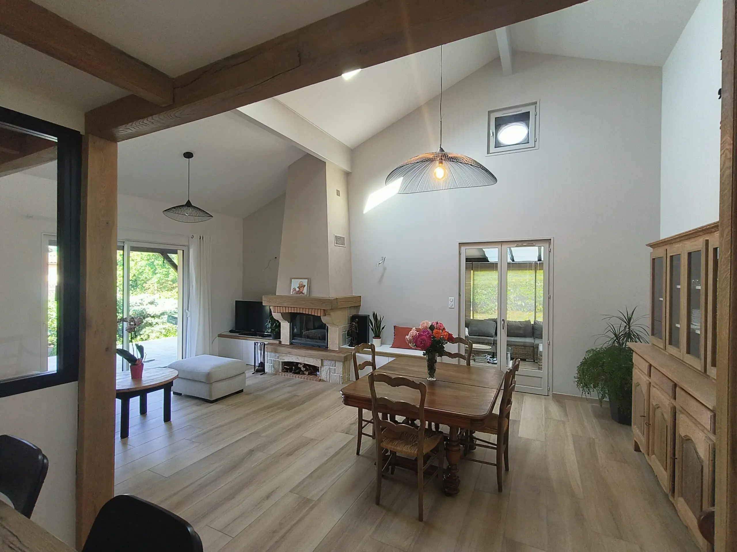 Le séjour bénéficie du carrelage effet parquet chêne qui apporte chaleur et réconfort. La cheminée rénovée devient un élément central de la décoration.