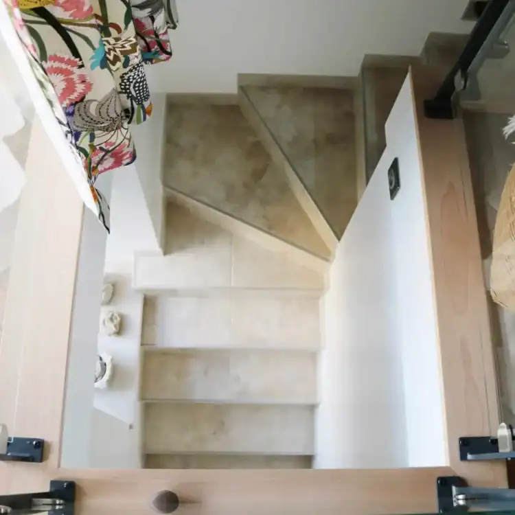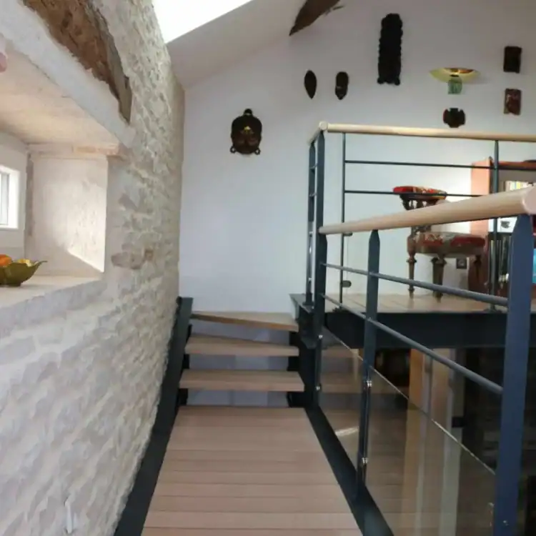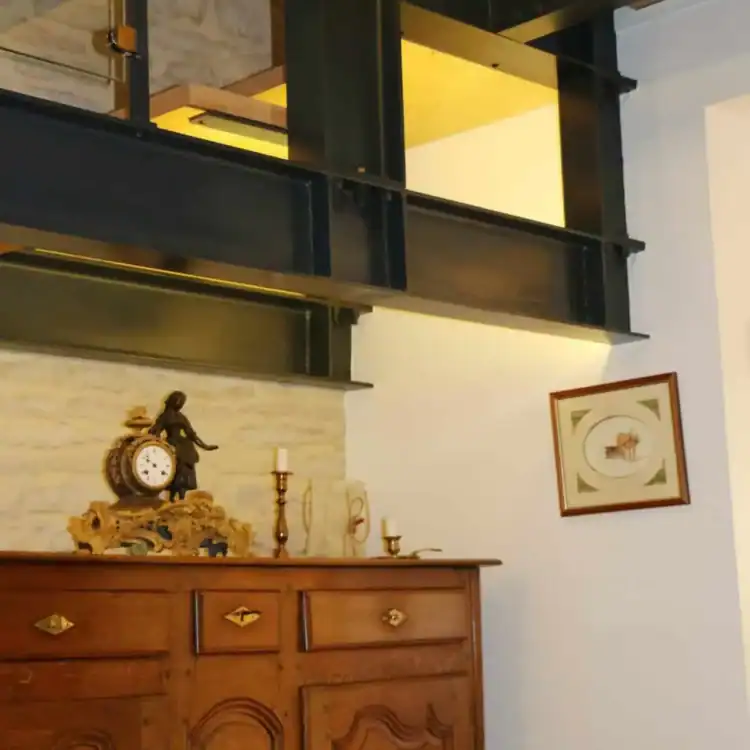 Le projet a commencé par des travaux de rénovation structurelle, notamment l‘isolation et la reconfiguration des espaces. Les murs en pierre ont été soigneusement nettoyés et restaurés, tandis que de nouvelles ouvertures ont été aménagées pour permettre une plus grande luminosité. L‘escalier a également été remplacé par un modèle en métal avec des marches en bois.