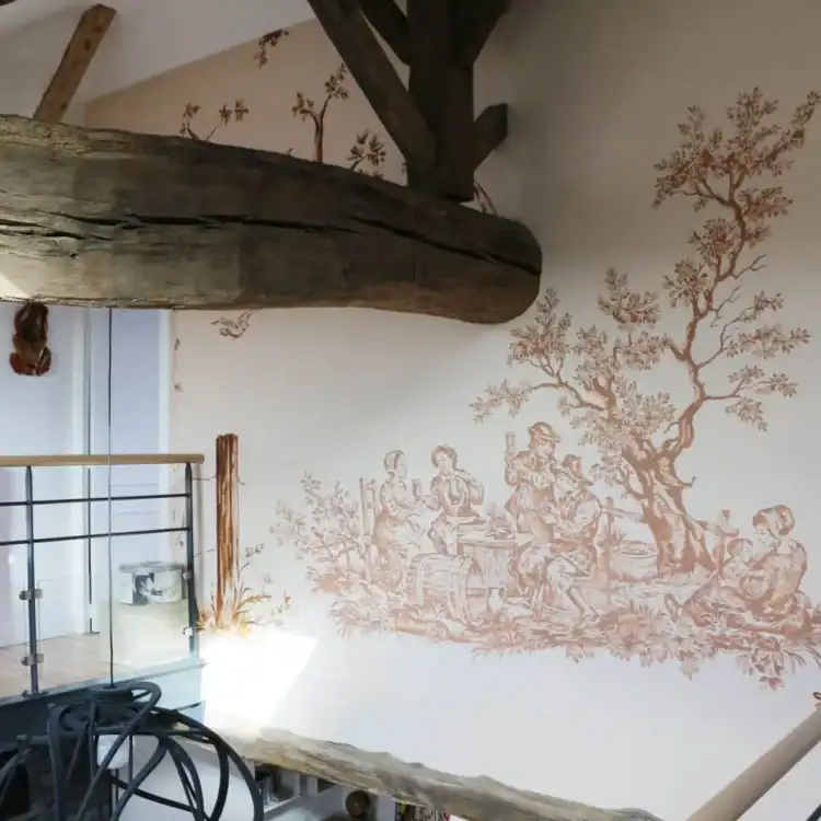 De plus, une passerelle métallique a été construite pour relier l‘étage. Dans la trémie d‘escalier, l‘agence Atelier Julien a eu la présence d‘esprit de conserver une fresque peinte à la main datant de plusieurs dizaines d‘années.