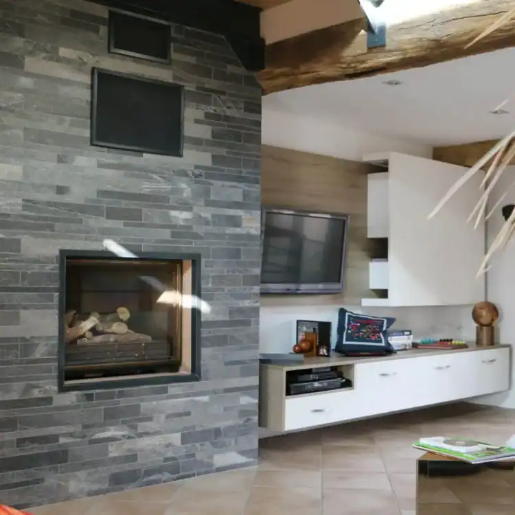 Le salon, séjour avec cheminée en pierre de parement, a été entièrement rénové et modernisé. Des matériaux modernes et des meubles d‘inspiration scandinave ont été ajoutés à l‘intérieur. Autres éléments distinctifs de cette belle maison, Les plafonds blanc isolés correctement, ont permis de mettre en valeur la belle charpente apparente, sablées pendant les travaux. Les sols ont été recouverts de pierre de bourgogne pour un look plus de caractère et contemporain. Des plantes, des tapis et des coussins ont été placés pour ajouter de la couleur et de la chaleur à l‘espace.