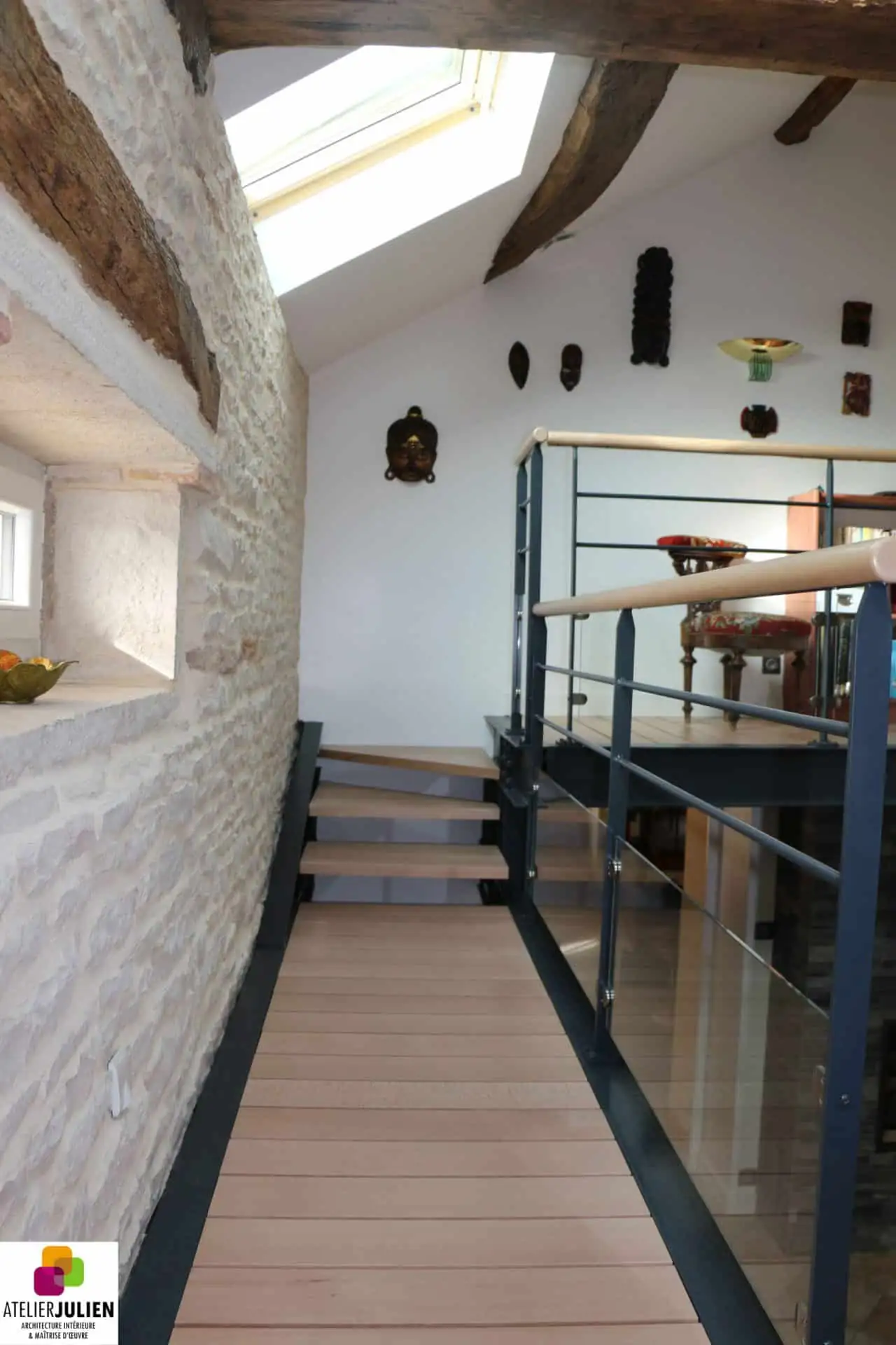 De plus, une passerelle métallique a été construite pour relier l‘étage. Dans la trémie d‘escalier, l‘agence Atelier Julien a eu la présence d‘esprit de conserver une fresque peinte à la main datant de plusieurs dizaines d‘années.