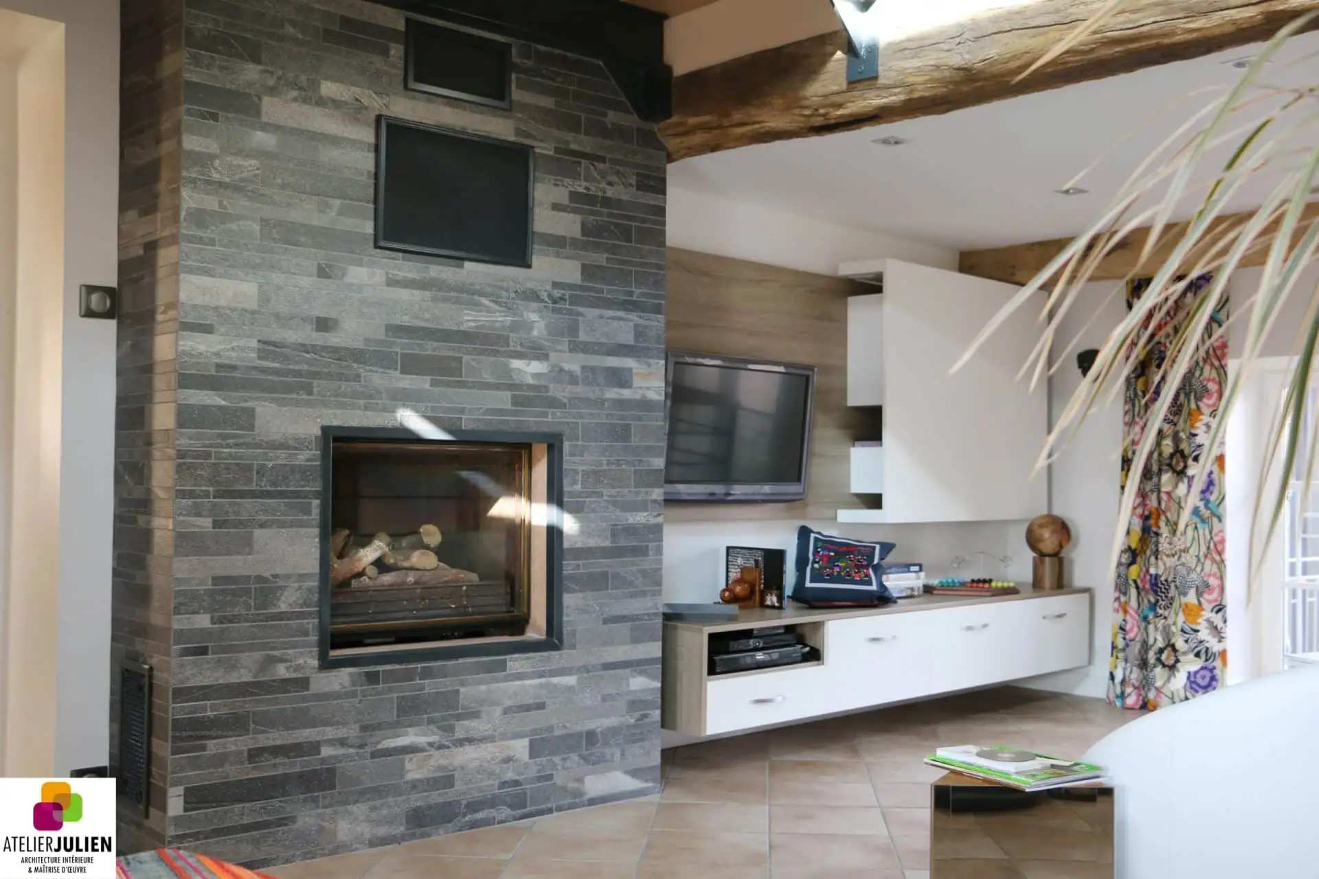 Le salon, séjour avec cheminée en pierre de parement, a été entièrement rénové et modernisé. Des matériaux modernes et des meubles d‘inspiration scandinave ont été ajoutés à l‘intérieur. Autres éléments distinctifs de cette belle maison, Les plafonds blanc isolés correctement, ont permis de mettre en valeur la belle charpente apparente, sablées pendant les travaux. Les sols ont été recouverts de pierre de bourgogne pour un look plus de caractère et contemporain. Des plantes, des tapis et des coussins ont été placés pour ajouter de la couleur et de la chaleur à l‘espace.